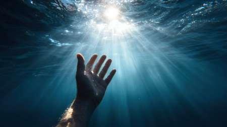 An evocative underwater scene of a hand reaching towards the light, evoking feelings of hope and escape. The vibrant blue and sun rays create a striking, dramatic visual perfect for concepts of freedom, resilience, and peace.