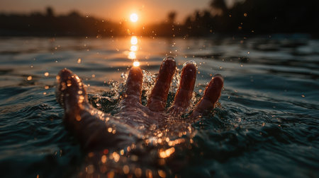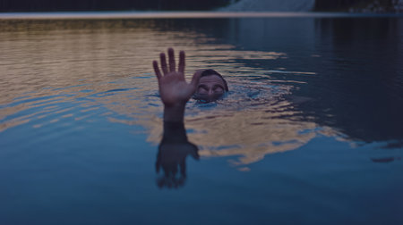 A swimmer in distress reaches out from the calm lake water just before sunset, creating a tense and emotional moment in nature.