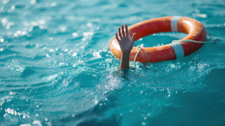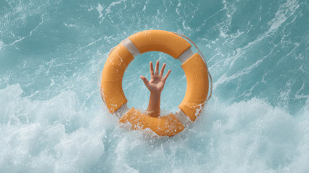 A single hand emerges from tumultuous ocean waves, grasping desperately at a bright life ring, portraying a vivid scene of struggle and hope for rescue in water.