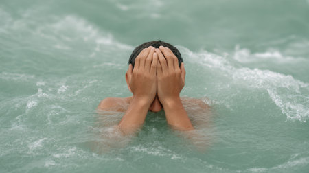 A young boy is immersed in water, covering his face with hands, conveying a moment of emotion. The scene captures the essence of childhood joy and playfulness.