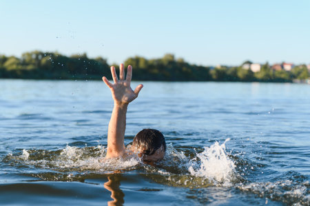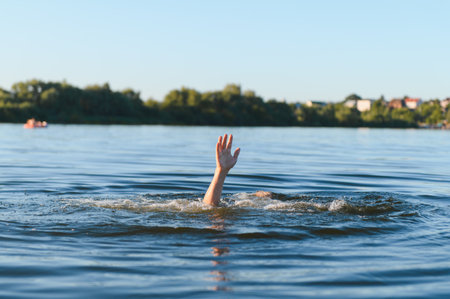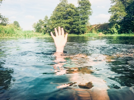 Drowning man is raising hand in river asking for help, concept of accident during summer vacation
