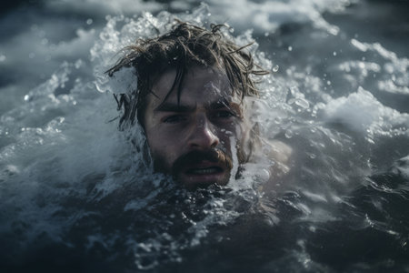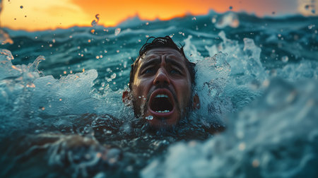 The concept of tragedy takes a poignant form in this image, where a man's scream desperate pierces through the splashing waves as he struggles against drowning in the sea.