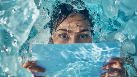 An artistic shot of a person fully immersed in an ice bath with the quote Embrace the struggle for it will lead you to greatness elegantly written on the side