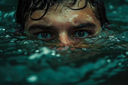 A man struggling to keep his head above the water, with his eyes wide with fear.