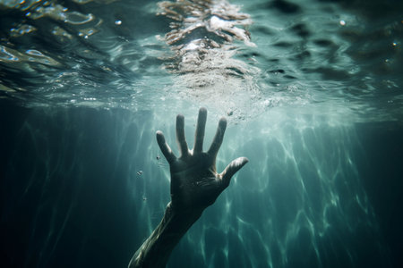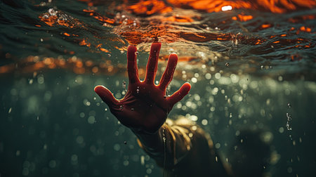 A powerful and evocative underwater shot of two outstretched hands, one seemingly struggling, the other reaching out in a gesture of assistance. Generative Ai