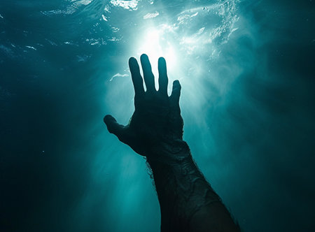 Man drowning in the water with his hand reaching for the light. Dark background.