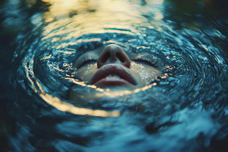 A peaceful close-up of a woman's face as she floats on calm water, eyes closed and surrounded by gentle ripples reflecting soft light.