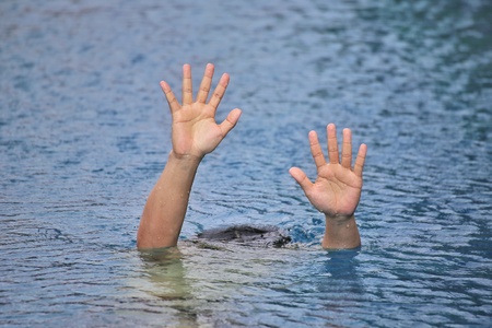 Drowning man's hands sticking out of water. Man drowning, gesture of help. Water help, drowning rescue, drowning, distress signal,