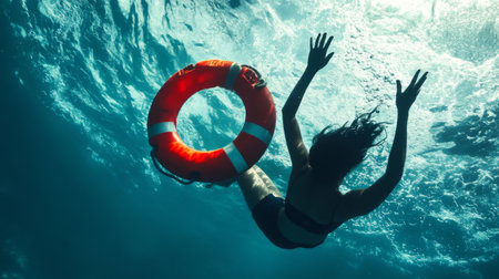 A woman finds herself submerged and reaching desperately for a lifebuoy, emphasizing the need for safety in water environments. The scene highlights the urgency of rescue at the pool.