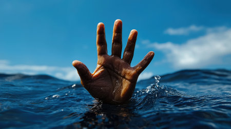 A hand emerges from turbulent ocean waves, symbolizing desperation and the struggle for survival. The powerful imagery evokes deep emotions and urgency.