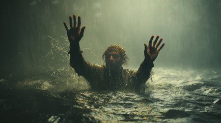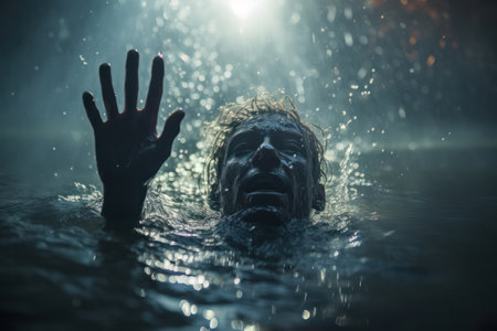 Man drowning in a lake, raising hands in a desperate plea for help, struggling against the water's grip