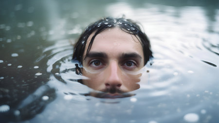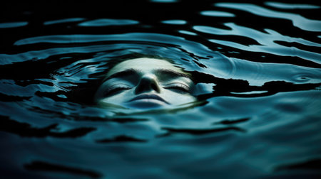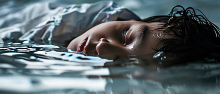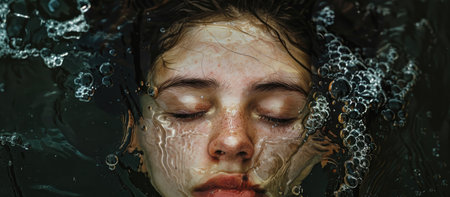 A close-up shot of a young person's face submerged in water, their eyes closed and mouth slightly open. Their dark hair is spread out around their head, and their skin is wet. The water is still and reflects the light, creating a shimmery effect.