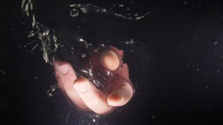With the palm of your hand, check or mix the water. Bottom view from under the water. Divine god hand. A finger is wearing a ring. Black background. Around the air bubbles and flows.