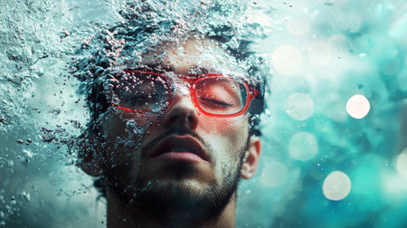 A dramatic portrait of a man underwater wearing red glasses, surrounded by bubbles and illuminated by soft turquoise light. Perfect for creative and abstract themes.