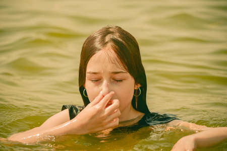 Close up of young beautiful girl in water. A girl swims in the river.Teenager girl on vacation. River, summer, swimming, nature