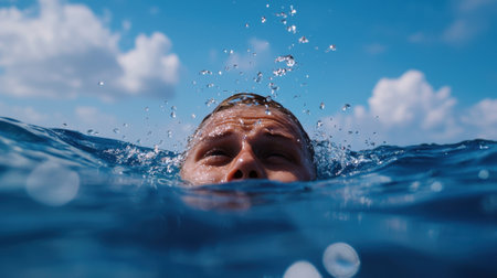 A man is floating in a pool of clear blue water, surrounded by tiles. He moves his arms and legs gracefully, propelling himself through the water. The ripples created by his movements reflect the sunlight.