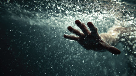 An image captures a hand submerged underwater, reaching upwards, surrounded by bubbles. The scene is dominated by dark, cool tones and a sense of depth. The composition focuses on the hand, with soft lighting enhancing the visual texture. This image could be used for various commercial or editorial purposes.