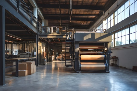 Large printing industrial machine processing large rolls of paper in a modern factory setting, showcasing the advanced technology and efficient workflow of contemporary printing processes
