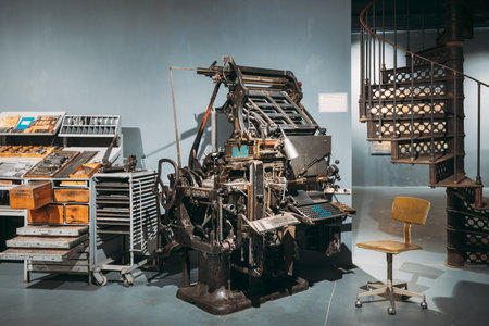 Typesetting Linotype Machine Produced In 1974. Dobrush Paper Mill Museum. Famous Landmark, Historical Heritage