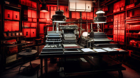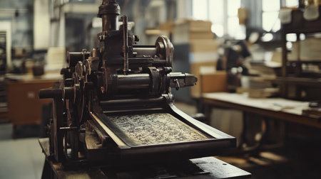 This image captures a vintage printing press in a historical workshop setting, showcasing intricate details of printmaking technology and craftsmanship.
