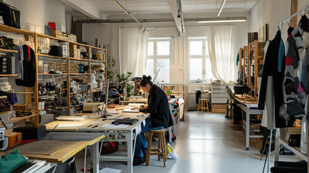 An authentic view of an artisan workshop, featuring a cluttered workbench filled with various tools, brushes, and materials, illuminated by warm light, highlighting creativity and craftsmanship.