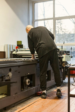 Technique for printing. Close up of dark-skinned man wearing striped shirt using technique in publishing office