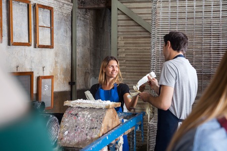 Horizontal shot of young man and cheerful woman working together in modern leather craft shop