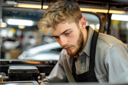 A man is focused on checking the oil level with a dipstick in a well-equipped workshop. Tools and vehicle parts are organized around him, highlighting his careful attention to detail.