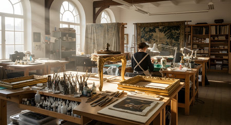 A professional art restorer works at a large desk in a sunlit studio, meticulously restoring an object. The workshop is filled with tools, brushes, paints, antique gilt frames, and a large tapestry, showing a dedication to conservation and craft.