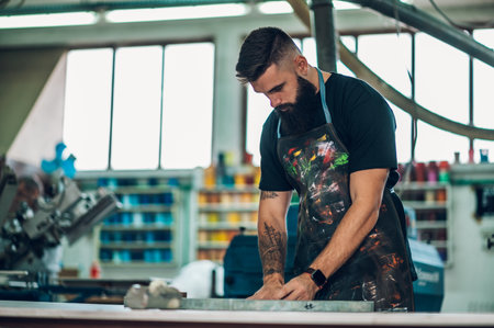 Male worker preparing screen printing film and wearing a dirty apron while working in a workshop