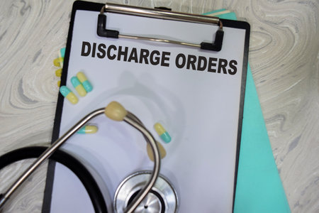 Concept of discharge orders write on clipboard isolated on Wooden Table. healthcare and pharmaceutical concept