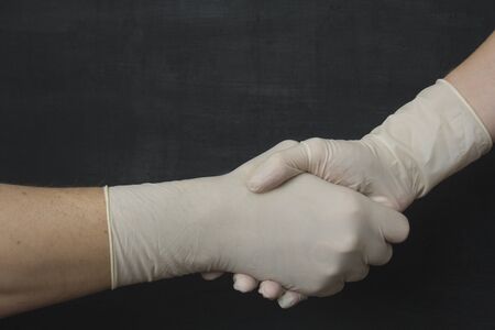 Handshake, greeting in medical rubber gloves. Hands in white medical latex rubber gloves on black background. Protective disposable gloves to protect against viruses, coronavirus, dangerous bacteria.