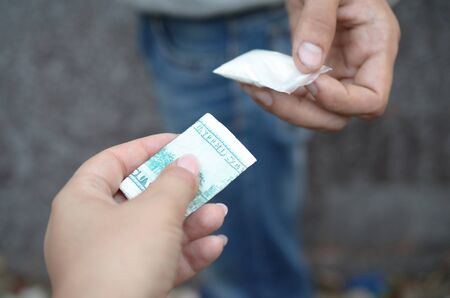 Hand of addict man with money buying dose of cocaine or heroine or another narcotic from drug dealer. Drug abuse and traffic concept.