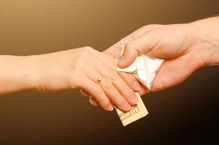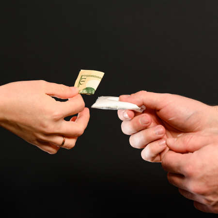 woman addict paying dollar money to drug dealer to buy dose of white powder cocaine. Money exchange for drugs. drug abuse and traffic concept.