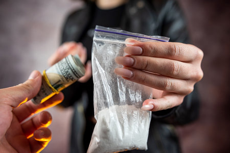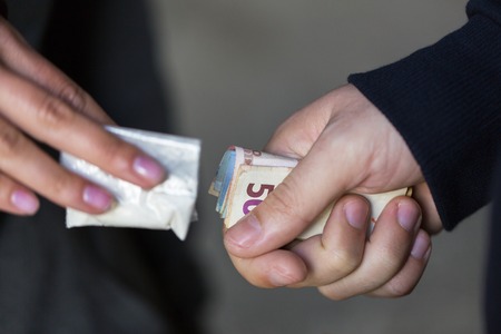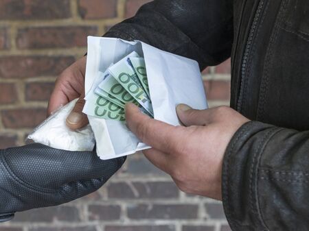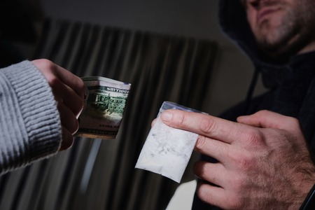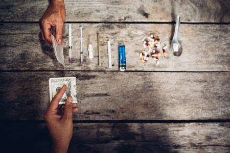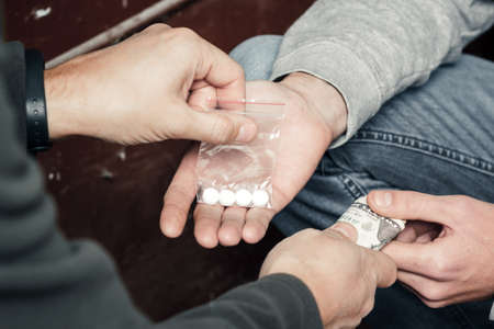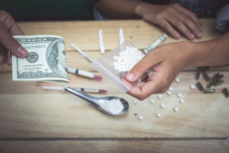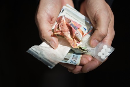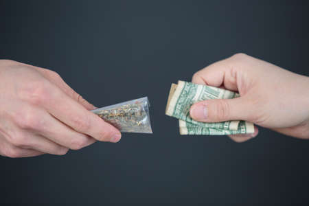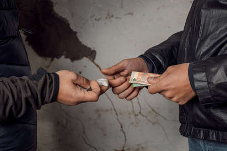 Hand of a drug addict with money, buys cocaine or heroin from a dealer. Drug sale concept.