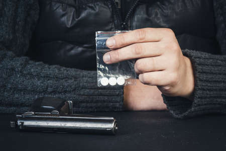 Drug addict man holds package of pills and powder