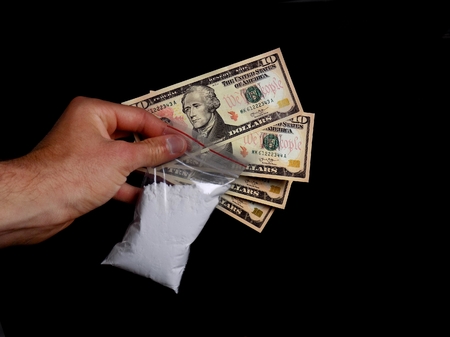 A person with money buys a dose of cocaine or heroin or other drug from a drug dealer.