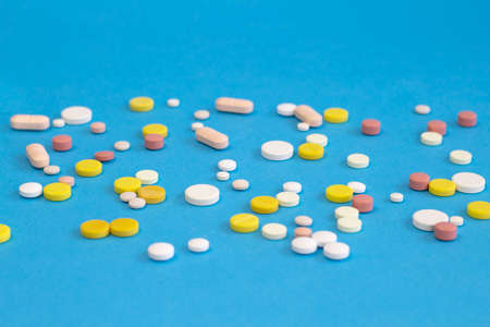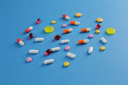 Multicolored pills of various shapes on a blue background. Close-up