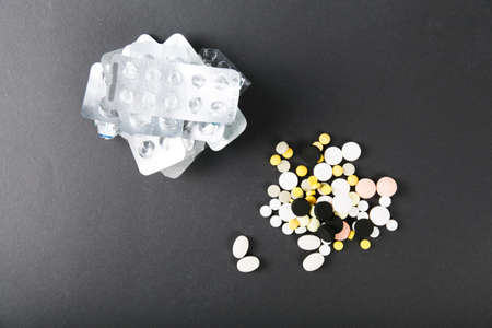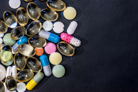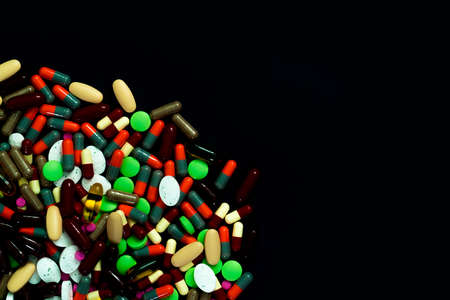 Pile of colorful tablets and capsules pills on black background. Global healthcare. Drug use in elderly people with chronic disease. Aging society problem. Drug, supplements, vitamins and minerals.