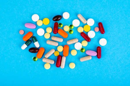 Pile of various drugs on blue background top view. Pills with tablets and capsules.
