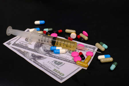Drug medicine syringe and money banknote on the black background, Expensive treatment concept