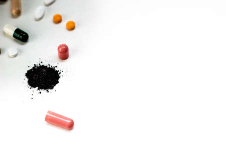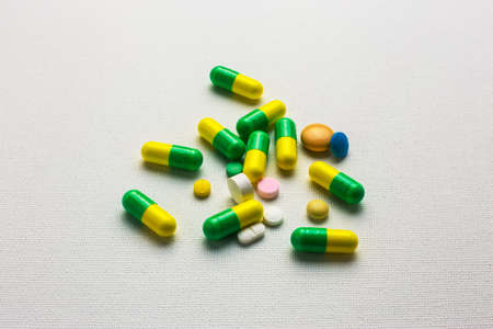 Many tablets and capsules pills on white canvas background