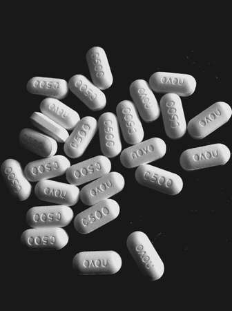 Pills close up on black background. Medical concept