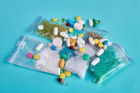 Colorful tablets with capsules and pills in medicine plastic zip lock bags