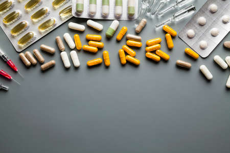 Different medicaments and empty space on gray background