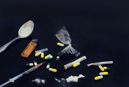 Various addictive drugs. cocaine, heroin and pills on a black table. The concept of drug addiction. view from above