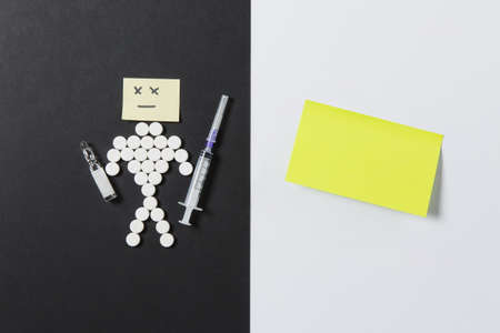 Medication round tablets arranged sad human on white black background. Yellow sticker, ampoule empty syringe needle, pills design. Treatment choice healthy lifestyle concept. Copy space advertisement