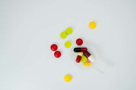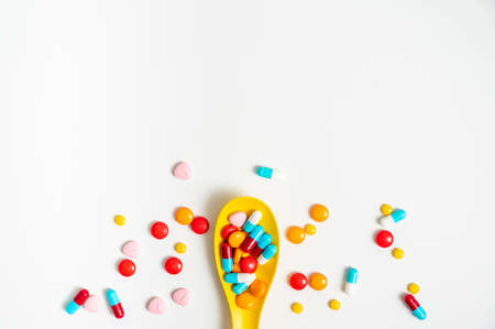 A lot of pills colorful in yellow plastic spoon on the white background. Medicine pills, tablets and capsules with copy space for text.