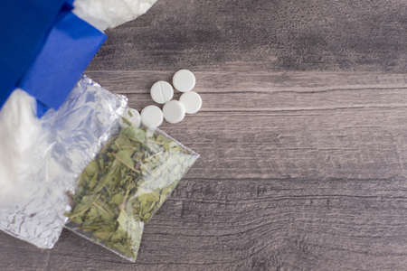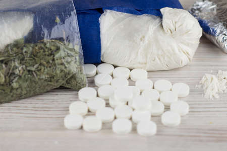 prohibited substance storage: a variety of drugs - heroin, cocaine, weed and suspicious tablet placed on a table to the left