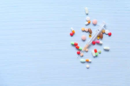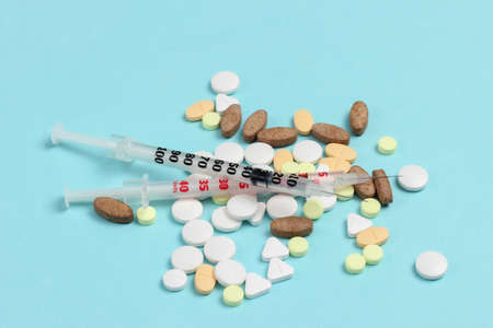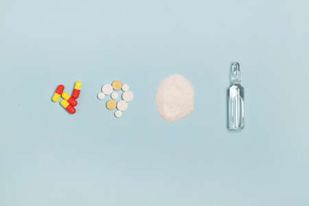 Various kinds of medical products on the blue background, medical composition of auf color capsules, white pills, ampoule with a transparent liquid drug and insulin syringe.